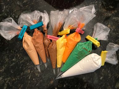 Each consistency of each color is bagged separately in piping bags either using tipless bags (for which you cut the opening to the size you want), or bags with special tips for certain designs (florals, leaves, etc.)