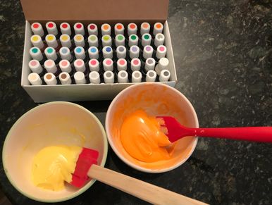 For each color, create the icing consistencies that will allow you to flood and decorate the cookies. Use icing straight out of the bowl for fine details or add a small touch of water for lettering or other details. To create a flood consistency, add just enough water so the icing will spread nicely across the cookie surface and settle easily, but not so thin that it flows over the edges of the cookie.