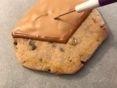 Once the cookies are cool and the icing bags are ready to go, carefully outline the edges of the cookie and fill in with the flood consistency, using a scribe tool to help the icing settle into a flat even layer.